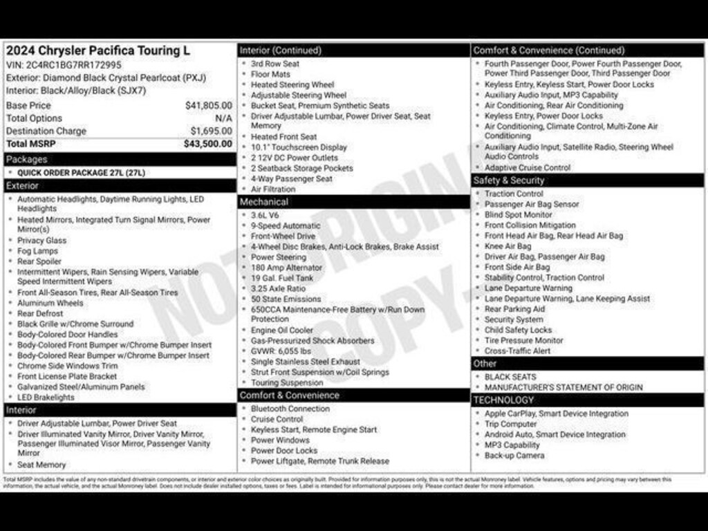 Key Chrysler Dodge Ram of Portsmouth is proud to present you with another True Market Priced Pre-Owned Vehicle. Transparent Pricing Of $ 27995 !! This 2024 Chrysler Pacifica Touring L is loaded with the following Factory Options: Quick Order Package 27L, 10.1" Touchscreen Display, 17" x 7.0" Aluminum Wheels, 3.25 Axle Ratio, 3rd row seats: split-bench, 4-Wheel Disc Brakes, 6 Speakers, ABS brakes, Air Conditioning, Alloy wheels, AM/FM radio: SiriusXM, Apple CarPlay, Apple CarPlay/Android Auto, Automatic temperature control, Black Seats, Brake assist, Bumpers: body-color, Caprice Leatherette Bucket Seats, Compass, Delay-off headlights, Disassociated Touchscreen Display, Driver door bin, Driver vanity mirror, Driver's Seat Mounted Armrest, Dual front impact airbags, Dual front side impact airbags, Electronic Stability Control, Four wheel independent suspension, Front anti-roll bar, Front Bucket Seats, Front dual zone A/C, Front fog lights, Front reading lights, Fully automatic headlights, Google Android Auto, GPS Antenna Input, Heated door mirrors, Heated front seats, Heated steering wheel, Illuminated entry, Integrated Active Noise Cancellation, Integrated Center Stack Radio, Knee airbag, Low tire pressure warning, Manufacturer's Statement of Origin, Memory seat, Occupant sensing airbag, Outside temperature display, Overhead airbag, Overhead console, Panic alarm, ParkView Rear Back-Up Camera, Passenger door bin, Passenger seat mounted armrest, Passenger vanity mirror, Power door mirrors, Power driver seat, Power Liftgate, Power steering, Power windows, Radio data system, Radio: Uconnect 5 w/10.1" Display, Rain sensing wipers, Rear air conditioning, Rear reading lights, Rear window defroster, Rear window wiper, Reclining 3rd row seat, Remote keyless entry, Security system, Speed control, Split folding rear seat, Spoiler, Steering wheel mounted audio controls, Tachometer, Telescoping steering wheel, Tilt steering wheel, Touring Suspension, Traction control, Trip computer, Turn signal indicator mirrors, USB Host Flip, Variably intermittent wipers, and Voltmeter!!