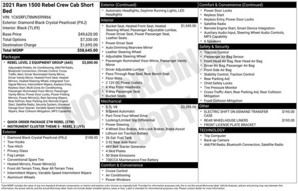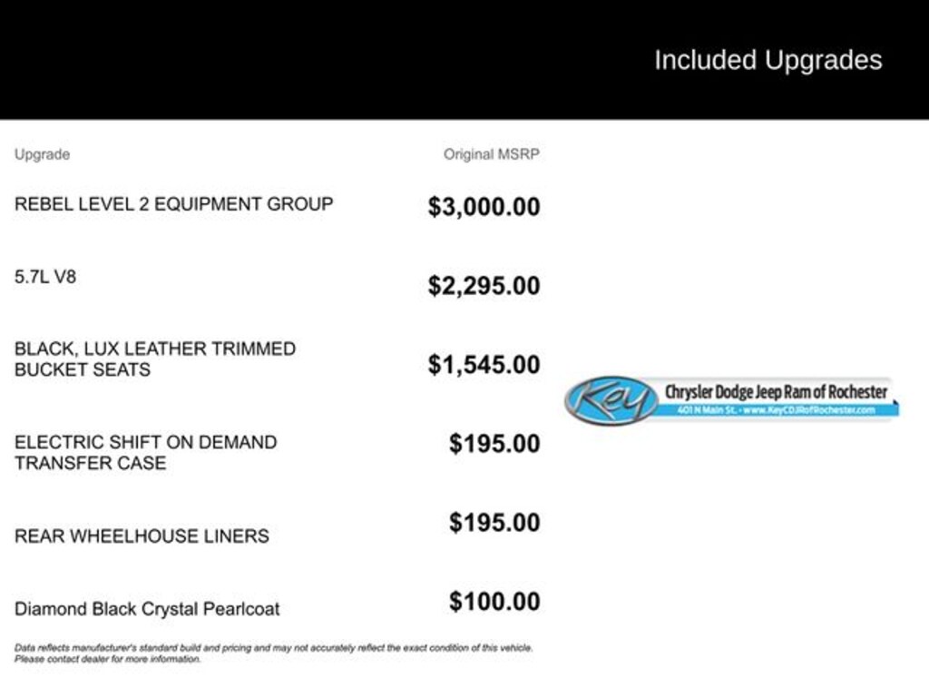 Key Chrysler Dodge Jeep Ram of Rochester is proud to present you with another True Market Priced Pre-Owned Vehicle. Transparent Pricing Of $ !! This 2021 Ram 1500 Rebel is loaded with the following Factory Options: Quick Order Package 27W Rebel, Rebel Level 2 Equipment Group (115V Auxiliary Rear Power Outlet, Air Conditioning ATC w/Dual Zone Control, Auto-Dimming Exterior Driver Mirror, Black Premium Power Mirrors, Body Color Door Handles, Exterior Mirrors Courtesy Lamps, Exterior Mirrors w/Supplemental Signals, Foam Bottle Insert (Door Trim Panel), Heated Front Seats, Heated Steering Wheel, Media Hub w/2 Charge Only USBs, ParkSense Front/Rear Park Assist w/Stop, Power Adjustable Pedals, Power-Folding Mirrors, Radio: Uconnect 4 w/8.4" Display, Rain Sensitive Windshield Wipers, Rear Dome w/On/Off Switch Lamp, Rear Underseat Compartment Storage, Rear Window Defroster, Remote Proximity Keyless Entry, Security Alarm, Sun Visors w/Illuminated Vanity Mirrors, and Universal Garage Door Opener), 3.92 Rear Axle Ratio, 4 Way Front Headrests, 4-Wheel Disc Brakes, 48V Belt Starter Generator, 6 Speakers, ABS brakes, Air Conditioning, Alloy wheels, AM/FM radio: SiriusXM, Auto-dimming Rear-View mirror, Black Exterior Mirrors, Brake assist, Bucket Seats, Cloth/Vinyl Low Back Bucket Seats, Compass, Delay-off headlights, Driver door bin, Dual front impact airbags, Dual front side impact airbags, Electric Shift-On-Demand Transfer Case, Electronic Stability Control, For More Info, Call 800-643-2112, Front anti-roll bar, Front Bucket Seats, Front Center Armrest w/Storage, Front fog lights, Front License Plate Bracket, Front reading lights, Front Seat Back Map Pockets, Front wheel independent suspension, Full Length Upgraded Floor Console, Fully automatic headlights, GPS Antenna Input, Heated door mirrors, Illuminated entry, Instrument Cluster Theme 5 - Rebel 2, Integrated Voice Command w/Bluetooth, Leather steering wheel, Low tire pressure warning, Occupant sensing airbag, Outside temperature display, Overhead airbag, Overhead console, Panic alarm, ParkView Rear Back-Up Camera, Passenger door bin, Passenger vanity mirror, Power 4-Way Driver Lumbar Adjust, Power door mirrors, Power driver seat, Power steering, Power windows, Radio data system, Radio: Uconnect 3 w/5" Display, Rear 60/40 Folding Seat, Rear anti-roll bar, Rear seat center armrest, Rear step bumper, Rear Wheelhouse Liners, Remote keyless entry, Remote Start System, SiriusXM Radio Service, SiriusXM Satellite Radio, Speed control, Split folding rear seat, Steering wheel mounted audio controls, Tachometer, Telescoping steering wheel, Tilt steering wheel, Traction control, Trip computer, Variably intermittent wipers, Voltmeter, and Wheels: 18" x 8.0" Painted Mid-Gloss Black!!